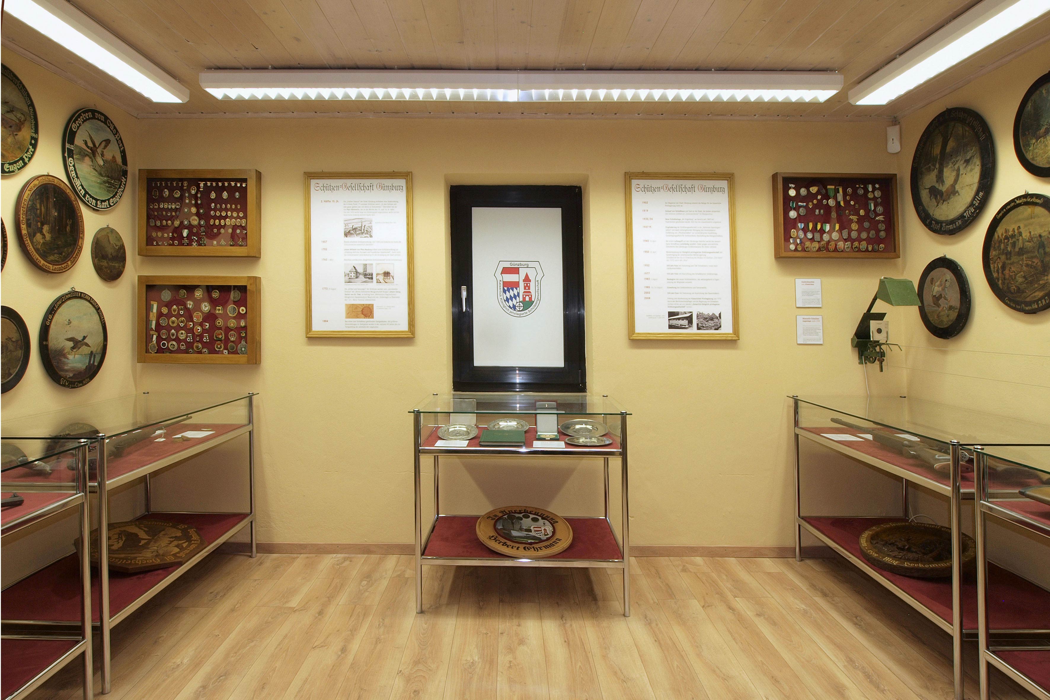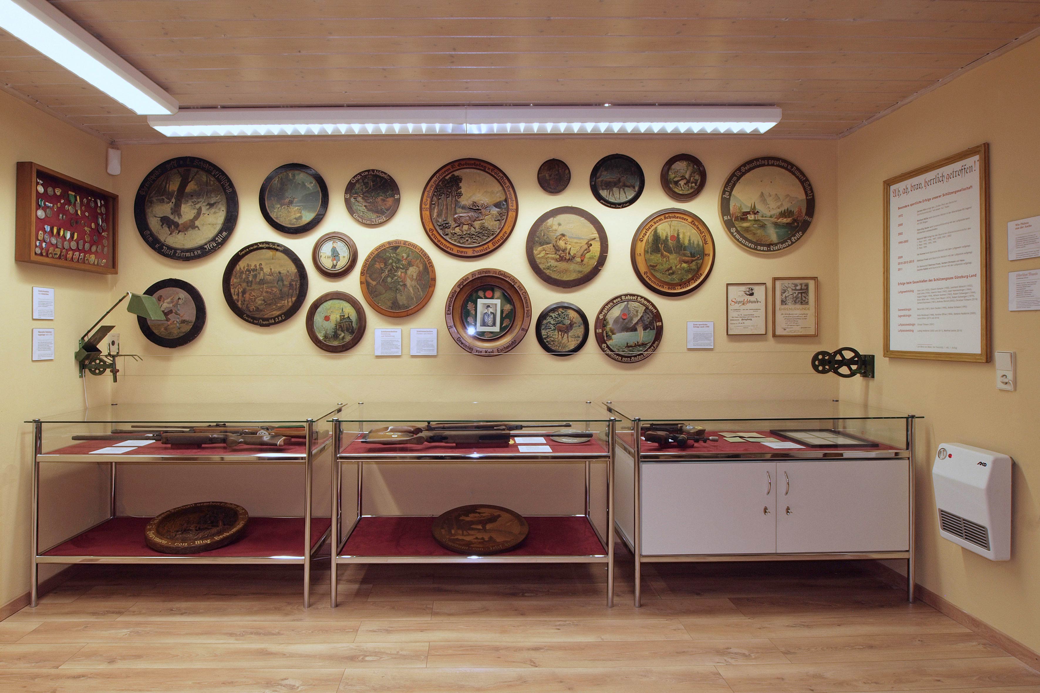 Zwei Wände zieren sehr alte oder besonders aussagekräftige Schützenscheiben. Sie tragen die Namen erfolgreicher Schützen und zeigen einen interessanten Wandel der Motive.