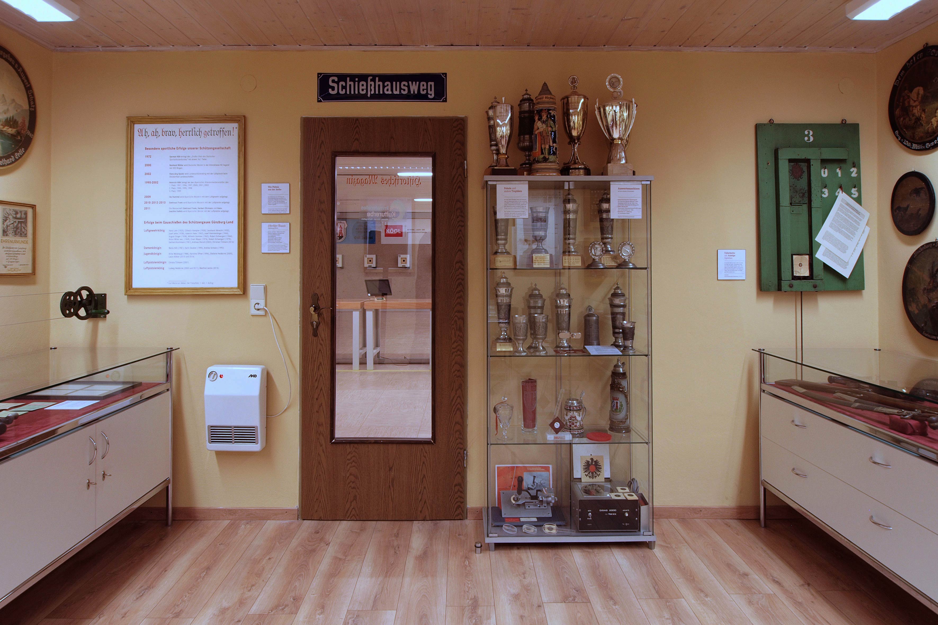 Dazu kommen noch drei funktionsfähige mechanische Trefferanzeigen, Auswertevorrichtungen und eine Schrankvitrine mit Siegestrophäen von besonderer sportlicher Bedeutung.